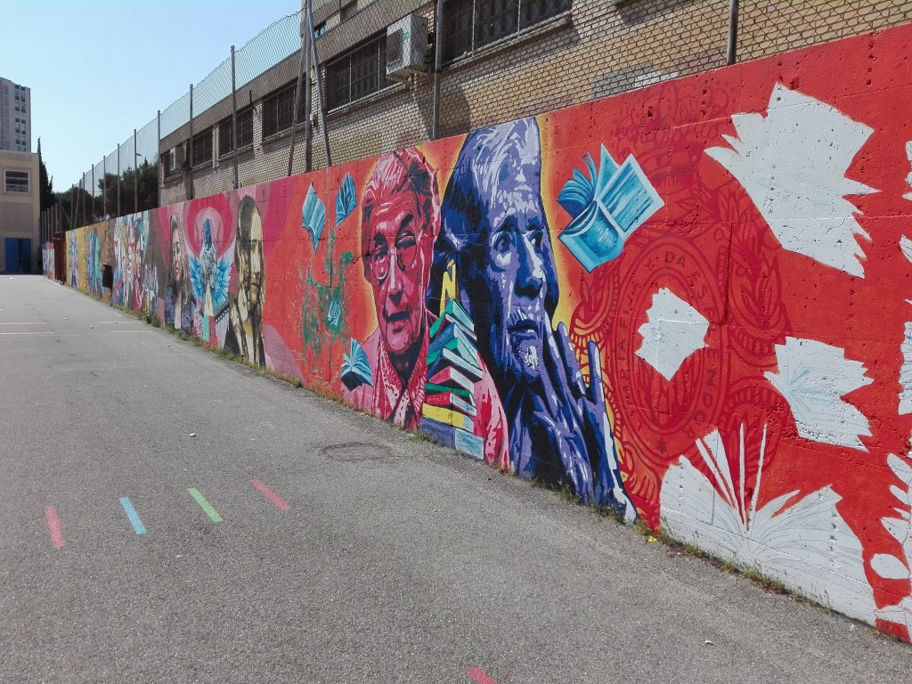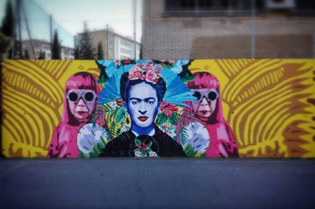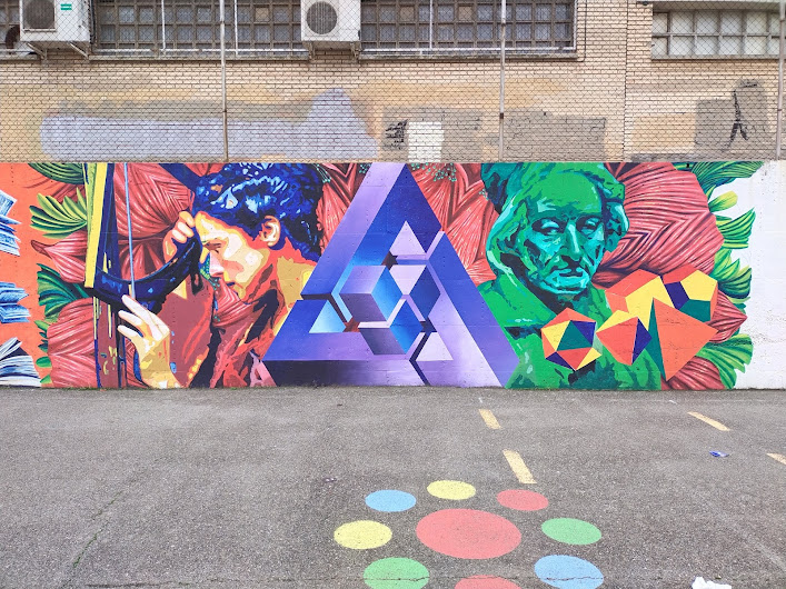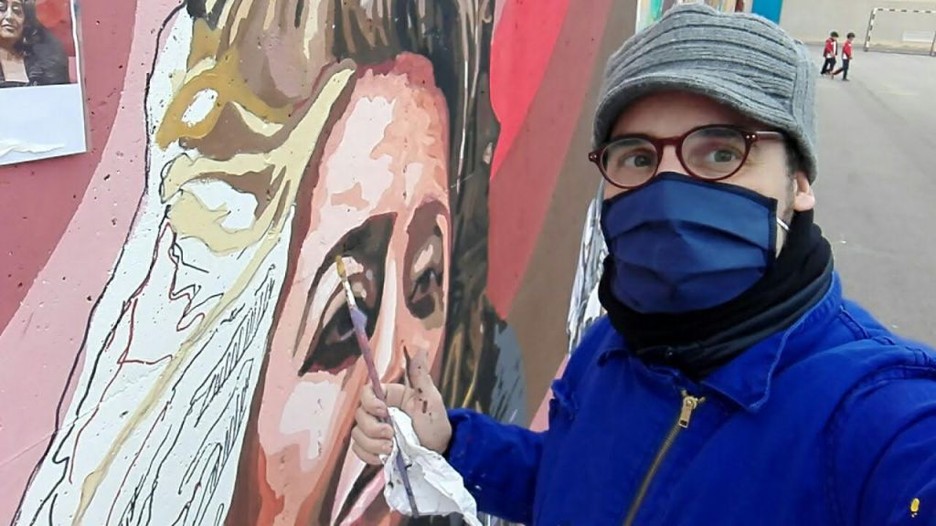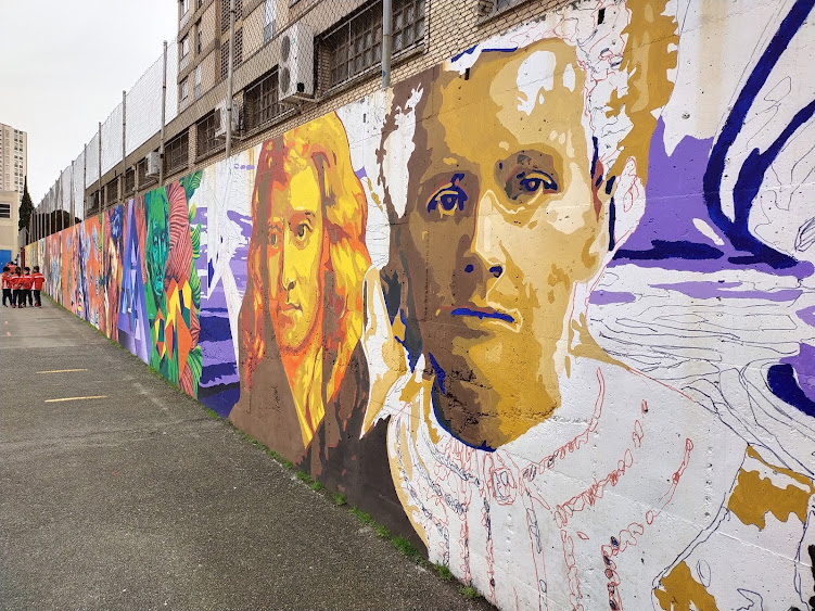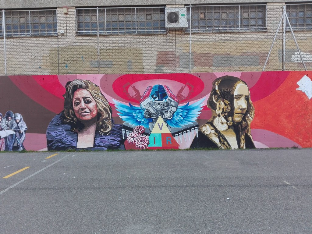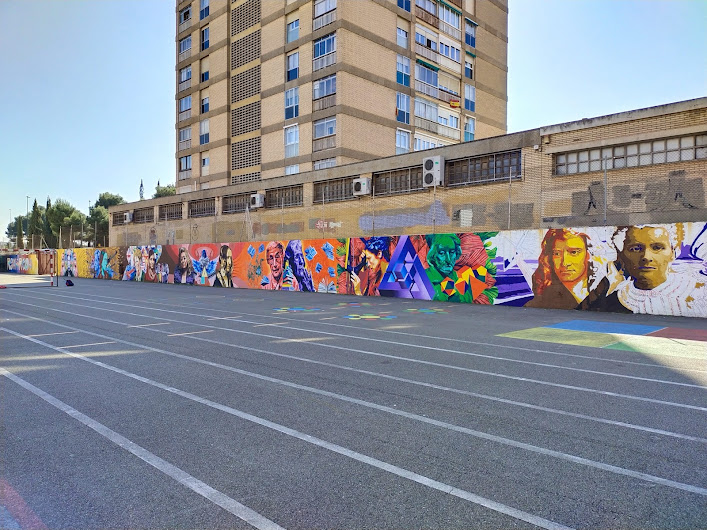 – Lejos de mermar nuestro entusiasmo, la peculiar situación provocada por la pandemia durante este curso lectivo nos ha hecho valorar como nunca la importancia de la creatividad, que constituye uno de los mejores antídotos contra el desánimo. También nos ha impuesto ciertas limitaciones: por ejemplo, este año, el proyecto mural Pintemos nuestro patio ha tenido que avanzar más lento, al no poder contar con la cooperación masiva del alumnado y tener que acometerse prácticamente en solitario por su coordinador, Javier Joven. Y sin embargo tampoco ha parado. Últimamente hemos podido contar de nuevo, respetando el protocolo anti Covid del centro, con la ayuda inestimable de una pequeña parte del alumnado voluntario. Se han realizado ya las pinturas pertenecientes a cinco de los doce departamentos que se verán reflejados cuando el proyecto concluya. Lucen sus rostros en el muro (citamos por orden): Frida Kahlo, Yayoi Kusama, Nadia Boulanger, Clara Schumann, Amelia Earhart, Malala Yousafzai, Ada Byron, Zaha Hadid, María Moliner y Ana Mª Matute. Acabamos de empezar con los rostros de Hypatia de Alejandría y Carl Friedrich Gauss.