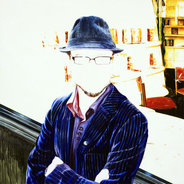 En efecto, la pintura representa un autorretrato sin rostro. La idea tiene un germen literario (aunque pintores que admiro enormemente ya se han pintado sin rostro, como Vermeer en su taller, por poner un ejemplo). Cuando leí Retrato del artista adolescente, de James Joyce, pensé en narrar en primera persona mis impresiones en torno al mundo del arte. Después de pasar una temporada en Latinoamérica, regresé a España al obtener una beca de residencia en la Casa de Velázquez. El contraste entre ambos mundos fue todo un estímulo. Dediqué toda mi beca a contar, a través de la pintura, mi experiencia en Paraguay, y cuando terminé la beca, le tocó el turno a mis vivencias en Madrid. Ambos proyectos son casi opuestos estilísticamente, pero sin duda están unidos por oposición. El primero fue un relato barroco y recargado, lleno de subjetividad, y el segundo una historia contada con aparente objetividad, algo frívola. El presente cuadro dio título al proyecto entero y fue de los primeros de la serie: Retrato del artista seducido. Todos ellos retrataban a artistas posando en eventos artísticos (fiestas e inauguraciones), y los rostros aparecían quemados de luz, comodesvaneciéndose. Se trataba de “des-egotizar” al creador (en efecto, los artistas andamos sobrados de ego), poniéndome a mi en el centro de la ironía. La imagen es toda una paradoja visual; si el autorretrato es el “éxtasis” de la individualidad, ¿qué pasa cuando sólo queda la máscara (gafas, perilla, sombrero) y los rasgos realmente personales son eliminados? La imagen es un juego entre lo que “promete” y lo que, de hecho, no es.