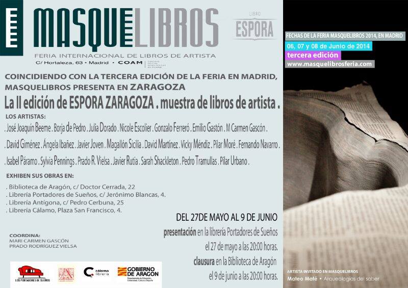 Además, otras sedes (Biblioteca de Aragón, Librería Portadores de Sueños, y Librería Cálamo) acogerán  los libros de artista de los siguientes autores: José Joaquín Beeme, Borja de Pedro, Julia Dorado, Nicole Escolier, Emilio Gascón, M.Carmen Gascón, David Giménez, Ángela Ibañez, Magallón Sicilia, David Martínez, Vicky Méndiz, Pilar Moré, Fernando Navarro, Isabel Páramo, Sylvia Pennings, Prado R.Vielsa, Javier Rutia, Sarah Shackleton, Pedro Tramullas y Pilar Urbano.