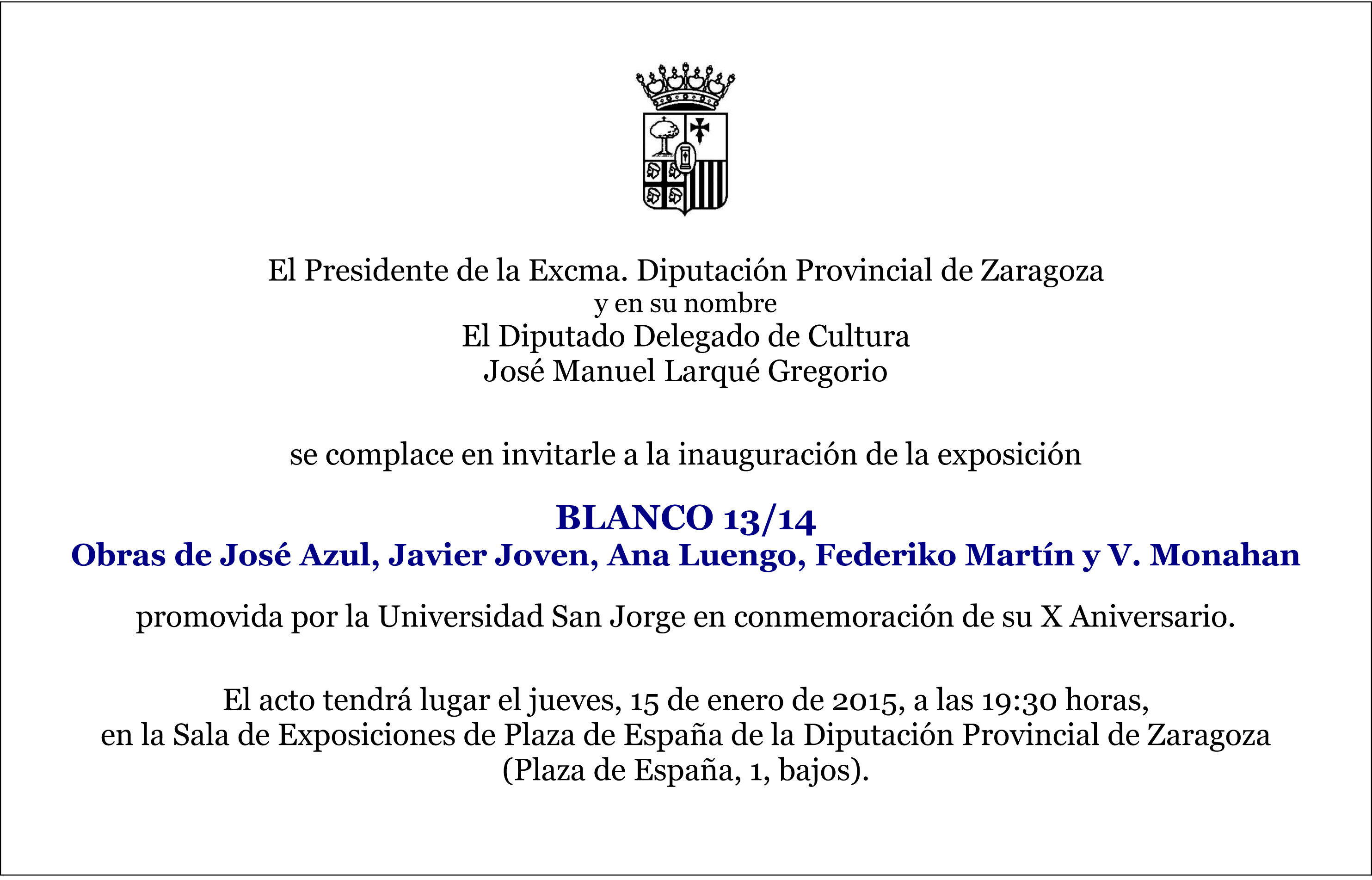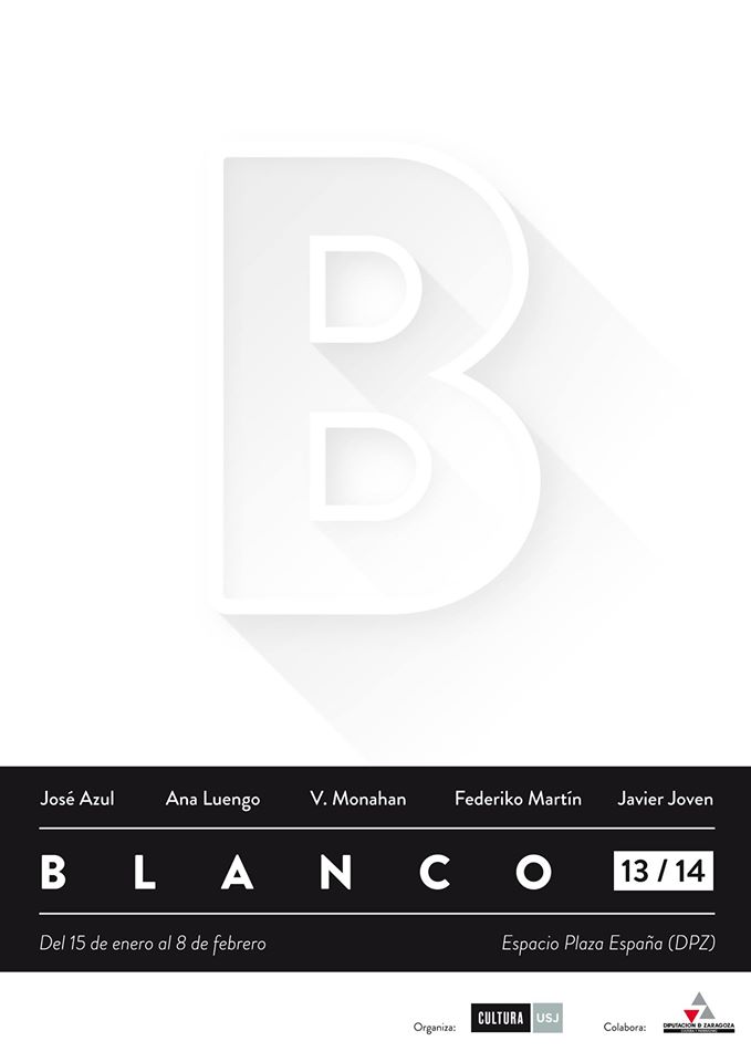 BLANCO 13_14El 28 de enero a las 19:30 h celebraremos, en en la Sala Plaza España de la Diputación Provincial de Zaragoza (antiguo Cuarto Espacio), el acto de presentación del libro-catálogo de la exposición «Blanco 13-14», organizada por el Servicio de Actividades Culturales de la Universidad San Jorge con la colaboración de la Diputación Provincial de Zaragoza.