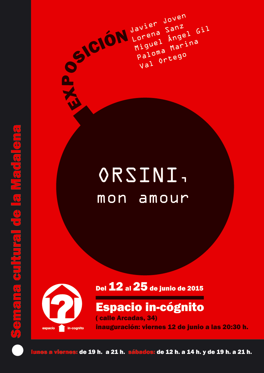 Espacio In-cógnito (2015) El pase de diapositivas requiere JavaScript. Exposición colectiva “Orsini, mon amour”. Espacio In-cógnito (C/ Arcadas 34, Zaragoza). Participantes: Lorena Sanz, Miguel Ángel Gil, Paloma Marina, Val Ortego y Javier Joven. Comparte esto: Haz clic para compartir en X (Se abre en una ventana nueva) X Haz clic para compartir en Facebook (Se abre en una ventana nueva) Facebook Haz clic para compartir en LinkedIn (Se abre en una ventana nueva) LinkedIn Me gusta Cargando...